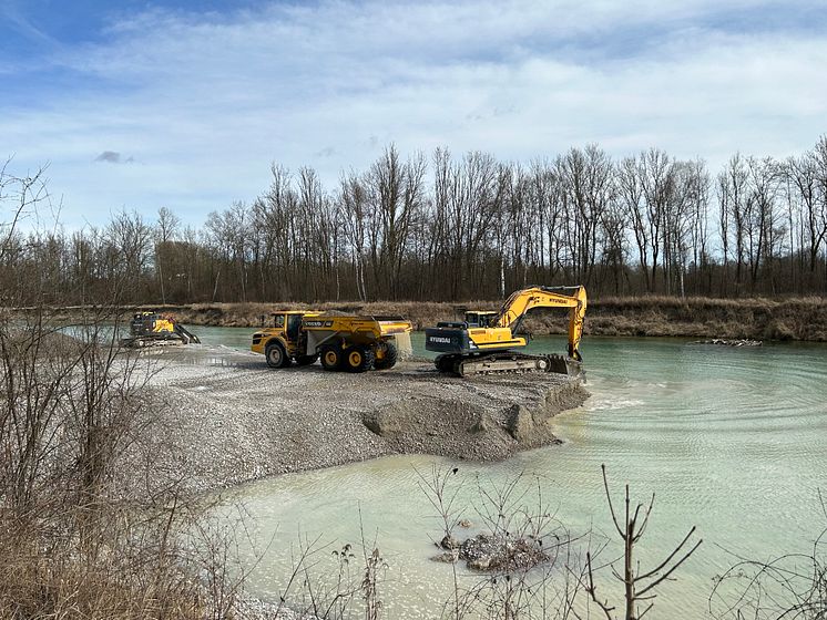 Bagger und LKW bei Baggerarbeiten am Lech / Höhe Ellgau