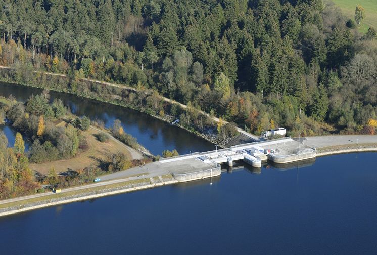 Luftaufnahme des Wasserkraftwerks Inningen.