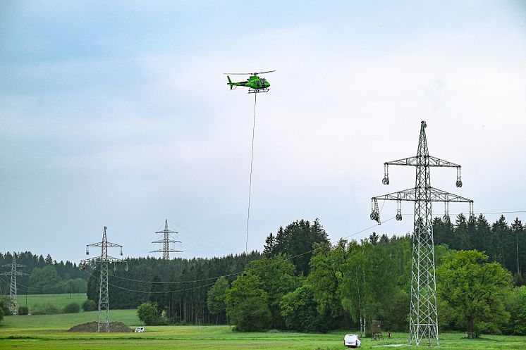 Die LEW Verteilnetz GmbH (LVN), der Betreiber des regionalen Stromnetzes, hat mithilfe eines Helikopters neue Leiterseile an der 110-kV-Leitung Honsolgen-Landsberg südlich von Landsberg eingezogen.