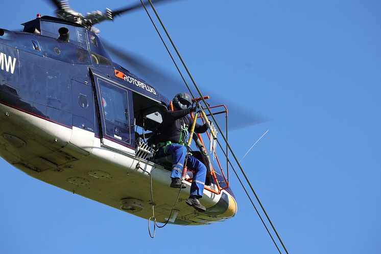 110-kV-Hochspannungsleitung Balzhausen-Erlingen. Vogelschutzmarkierungen werden mit einem Hubschrauber angebracht.