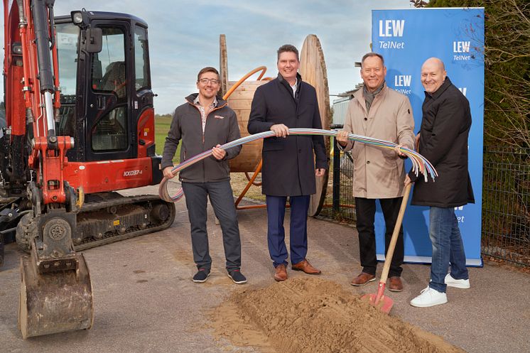 Beginn des Glasfaserausbaus in den Wertinger Ortsteilen: Manuel Gillich, VG Wertingen, Jörg Steins, Geschäftsführer LEW TelNet, Willy Lehmeier, Erster Bürgermeister der Stadt Wertingen und Christian Bracharz, Projektbeauftragter Breitband bei LEW TelNet.