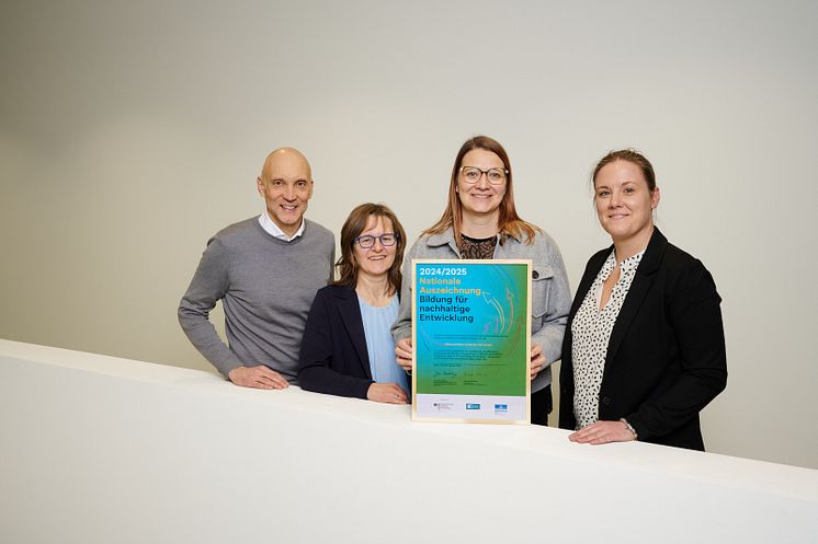 Das Team der LEW-Bildungsinitiative 3malE freut sich über die "Nationale Auszeichnung - Bildung für nachhaltige Entwicklung (BNE)" 2024/2025. v.l.: Thoms Renz, Leiter der Bildungsinitiative, Petra Schuster-Klante, Elke Ehinger, Nicole Hermann.