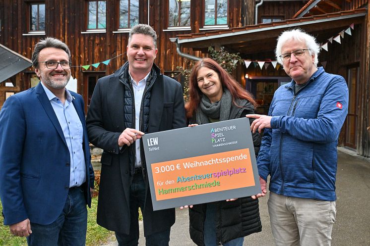 v.l.n.r. Sebastian Haggenmüller, Geschäftsführer TelNet, Jörg Steins, Geschäftsführer TelNet, Ruth Knöpfle, Leitung pädagogischer Betrieb Abenteuerspielplatz und Lutz Fischer, Vorstand Trägerverein