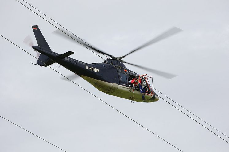 Hochspannungsleitung, Helikopter, Mann aus Helikopter gelehnt mit Vogelschutzmarkierung in der Hand