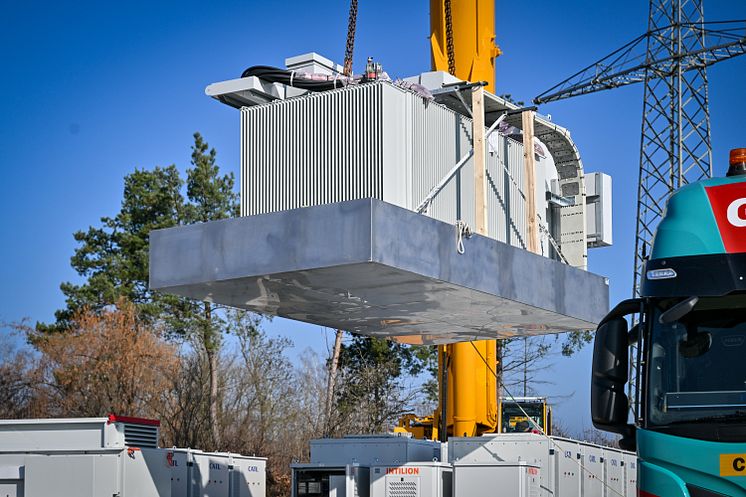 Anlieferung des Batteriespeichers am Wasserkraftwerk Gersthofen für das Hybridkraftwerk.