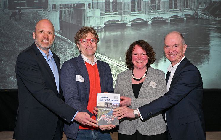 Die LEW-Vorstände Christian Barr (l.) und Dietrich Gemmel (r.) mit den Autoren Matthias Georgi (2.v.l.) und Katharina Roth von der auf Unternehmenshistorien spezialisierten Agentur Neumann & Kamp bei der Vorstellung der LEW-Unternehmensgeschichte.
