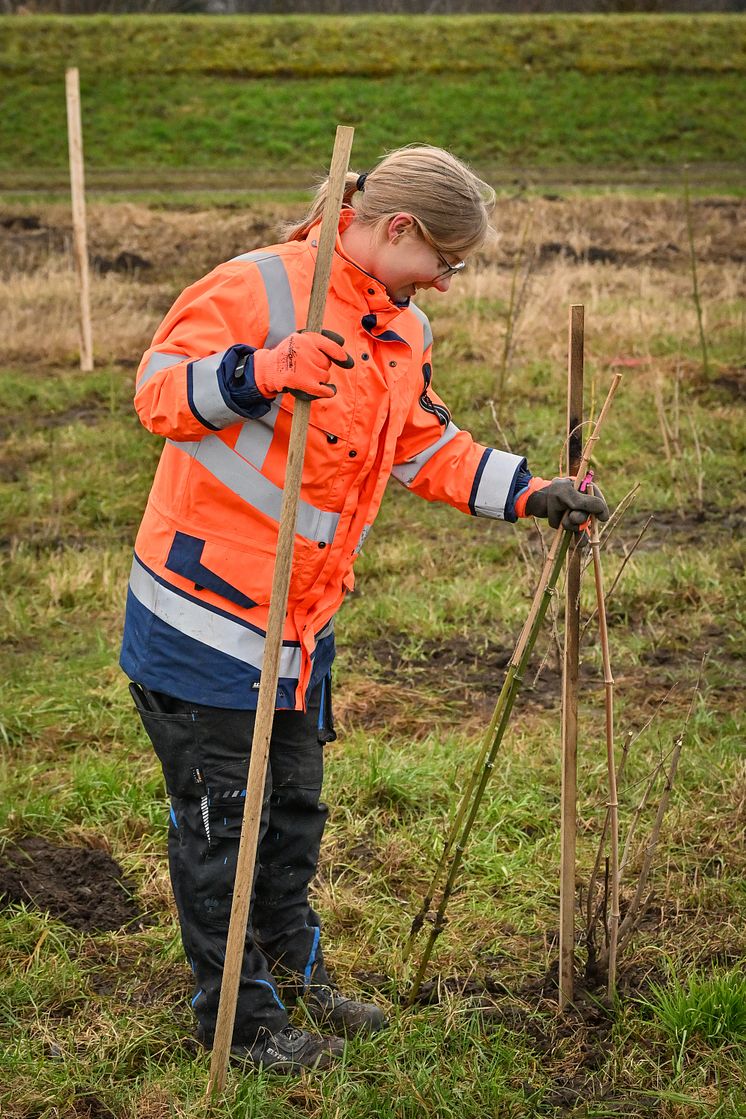 LEW-Auszubildende Ina Krippner bei der Befestigung von Markierungsstangen für die Baumsetzlinge
