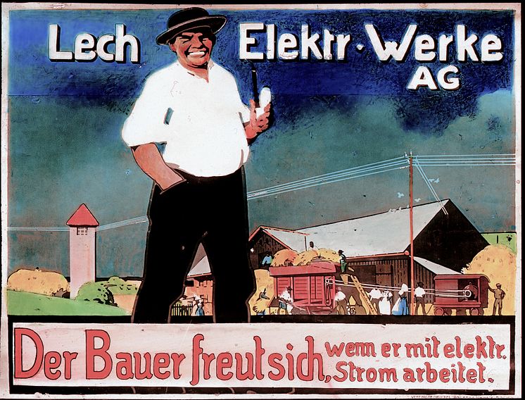 In der ersten Hälfte des 20. Jahrhunderts zielten die Werbemaßnahmen der Lechwerke auch auf die Abnehmer aus Landwirtschaft: Elektrizität erleichterte die Arbeitsabläufe, so suggeriert es dieses Werbeplakat der 1920er oder 1930er Jahre.