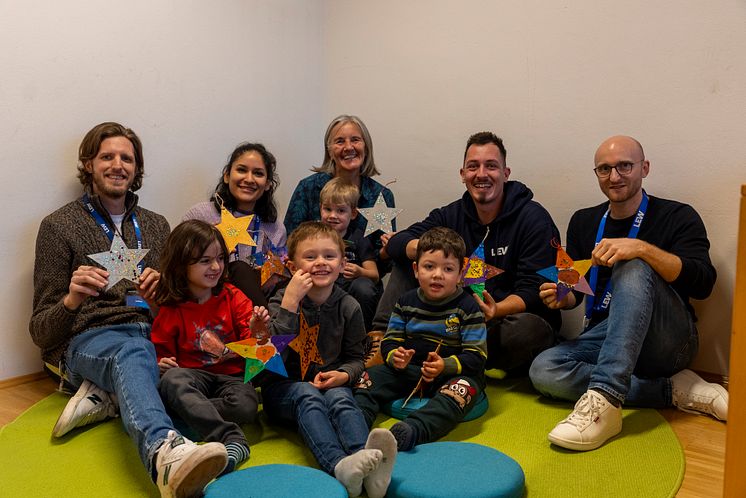 Bei der Abholung der Sterne: LEW-Vertreterinnen und Vertreter zusammen mit Kindern und Gruppenleiterin Sabine Franz (in der Mitte) von der Lebenshilfe Landsberg