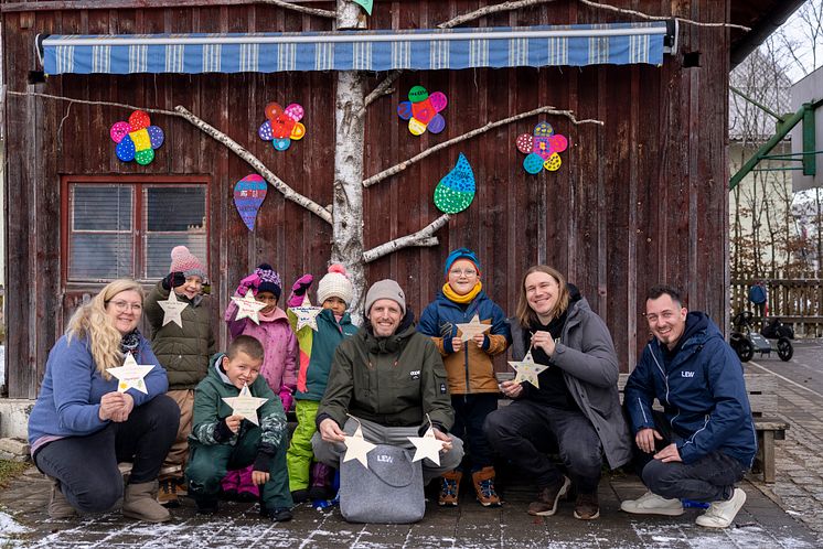 Bei der Abholung der Sterne: Einrichtungsleiterin Karin Oswald zusammen mit Kindern des Kinderhaus Forsthaus Peiting und den LEW-Vertretern Lukas Schmidl, Dr. Sebastian Tölle und Simon Roth