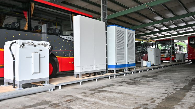 In dem Elektrifizierungskonzept läuft der Strombezug aus dem öffentlichen Netz auf der 20 kV-Mittelspannungsebene: Eine unmittelbar am Unternehmensstandort installierte Trafostation wandelt den Strom auf die im Arealnetz des Betriebshofes benötigte Betriebsspannung von 400 V Wechselstrom (AC) um. Damit steht die komplette Leistung der Trafostation dem Standort zur Verfügung. Sie hat genug Leistung, damit an einem Standort zusätzlich zum bisherigen Strombedarf mehr als 25 leistungsfähige Schnellladepunkte gleichzeitig betrieben werden können.