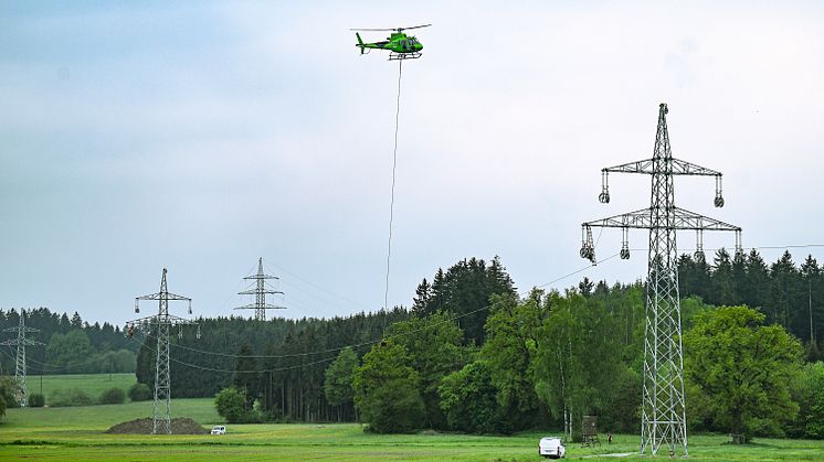 Helikopter im Einsatz für LEW Verteilnetz: Neue Leiterseile für die 110-kV-Hochspannungsleitung zwischen Honsolgen und Landsberg
