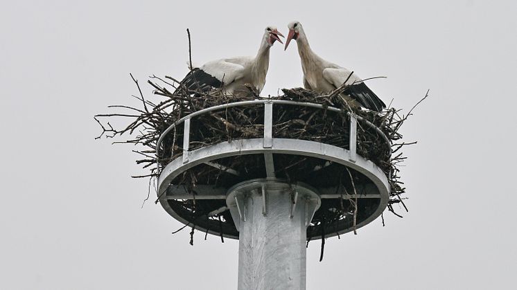 Die Montage erfolgte noch rechtzeitig vor Brutbeginn und dauerte einen ganzen Vormittag: Zunächst wurde das Nest mit einem Kran vom Mast gehoben. Am Boden brachten Mitarbeiter das Nestmaterial in die Nisthilfe aus Stahl ein. Erst dann wurde der Korb samt Nest wieder auf den Mast gehoben und befestigt. Nach Abschluss der Arbeiten bezog das bereits wartende Storchenpaar sein neues Nest.