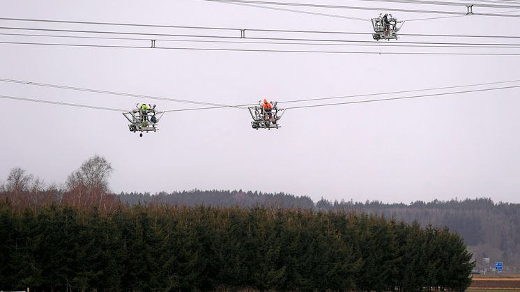 Pressefoto 1: Hochspannungsmonteure arbeiten in speziellen Leitungsfahrwägen um Abstandshalter zwischen den Leiterseilen zu montieren.