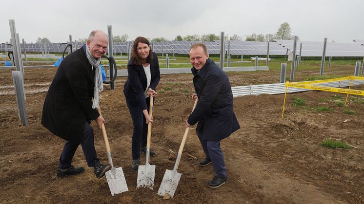 (v.l.n.r.): LEW-Vorstandsmitglied Dietrich Gemmel, Simone Bockaj, Vorstandsmitglied der Energiegenossenschaft LEW-BürgerEnergie, und Bobingens Bürgermeister Klaus Förster beim Spatenstich für die Erweiterung des Solarparks.