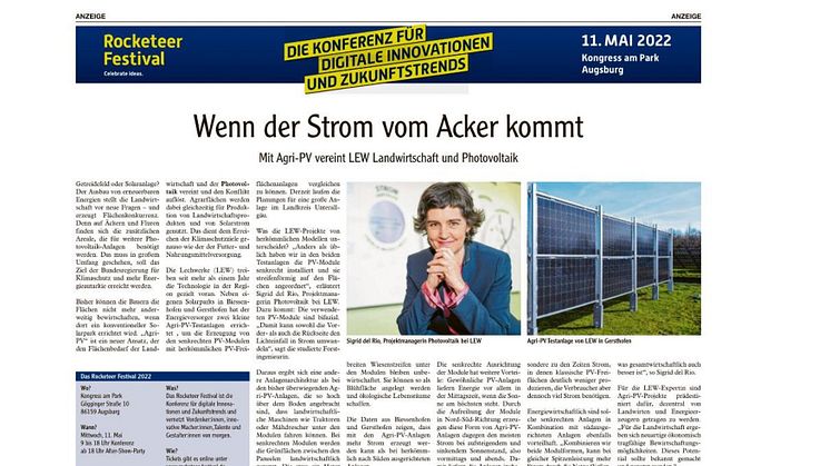 LEW hat hierzu zwei Pilotanlagen umgesetzt. Bei diesen stehen die Module senkrecht und erzeugen auf beiden Seiten Strom. So bringen sie morgens und abends die höchste Leistung – eine sehr gute Ergänzung zu herkömmlichen Anlagen, deren Leistungshöhepunkt in den Mittagsstunden liegt. Im Juli dieses Jahres hat LEW Agri-PV erstmalig im Rahmen des Rocketeer-Festivals im Kongress am Park einer breiten Öffentlichkeit vorgestellt. Die Resonanz war sehr positiv.