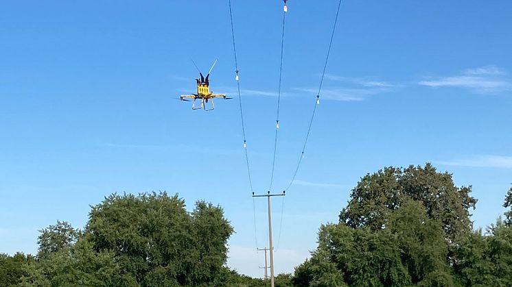 BU: Im Abstand von zirka 10 Metern werden die Vogelschutz-Marker mit einer Montageklemme in die Leitung eingehängt. Mit einer Drohne können sie auch in schwer zugänglichen Bereichen wie hier an der Freileitung bei Burgheim schnell und ohne großen Aufwand installiert werden.